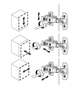 Profondeur : Certaines charnières ont une vis de réglage de la profondeur qui permet de rapprocher ou d'éloigner la porte du caisson. Cela est utile pour assurer que la porte se ferme correctement sans être trop enfoncée ou trop sortie.