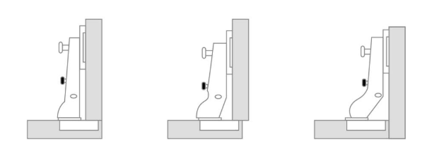 - Charnière en applique (à gauche) : La porte recouvre quasi-entièrement la paroi du caisson lorsqu’elle est fermée. C’est le type de charnière le plus courant, utilisé pour des meubles sans cadre.